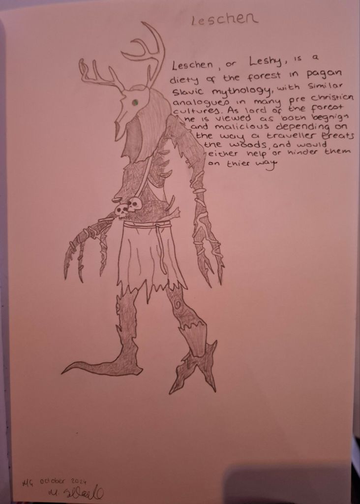 I really enjoyed this one. As a pagan myself I have a very deep interest in the natural world and it’s various personifications and manifestations. Leschen is, in my mind, the Slavic equivalent to the Diety I associate with most, the Celtic God Cernunnos and as such I felt like this one was very close to home. I based the image off the depiction of Leschen in “The Witcher” games, giving him a textured body (which I attempted to make look like interwoven sticks). Just as the mushrooms on his body and skulls at his waist represent death and decay, so to do the vines growing around his arms represent life, emphasising the role of death and rebirth in the earth’s natural cycles.